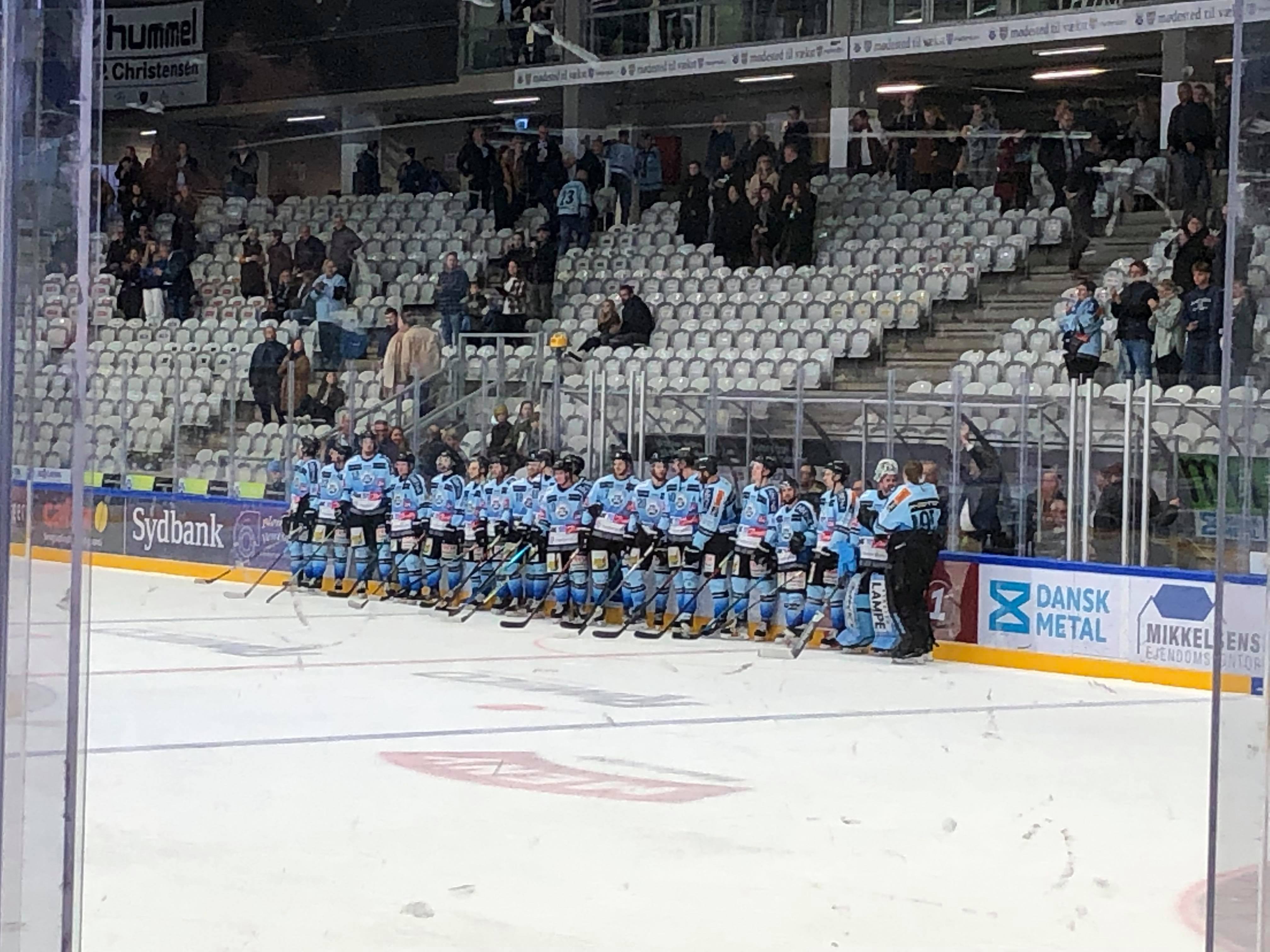 Hjemmeholdets pres gav bonus efter små fire minutter. Daniel Galbraith lagde pucken på mål, hvor Martin Eskildsen styrede pucken i nettet bag Horak. 1-0 og et hav af bamser på isen i Vojens. Steffen Frank var millimeter fra at fordoble føringen kort efter, men hans elegante baghånds afslutning strøg snart forbi fjerneste stolpe.