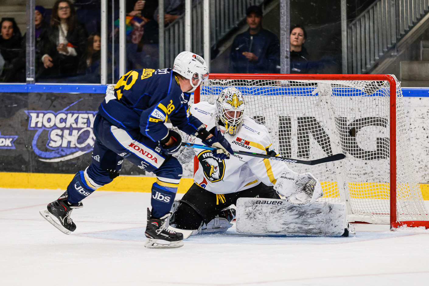 Herning Blue Fox - Herlev Eagles: 5-1 (1-0, 4-1, 0-0) Oskar Drugge var tilbage for Herning der til aftenens kamp måtte undvære Miska Humaloja og Frederik Brændgaard. Gæsterne drog til Midtjylland med præcis tre kæder og var således ramt en smule på bredden og Herlev måtte tage hjem over bælterne med et nederlag - nøjagtig som i sidste uge i Esbjerg.