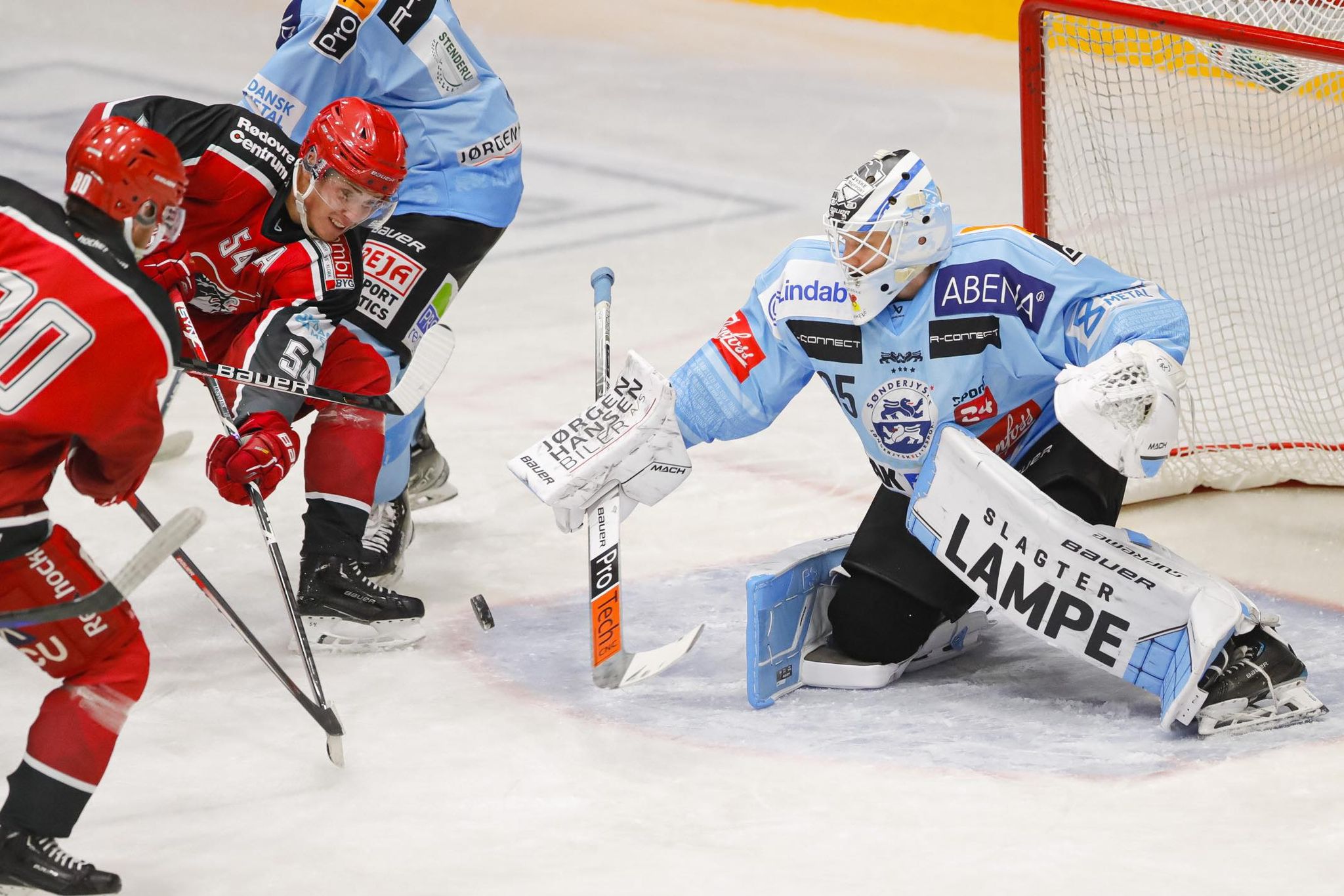 SønderjyskE-overtag fra begyndelsen af anden periode. Alexandre Lavoie var ved at overliste William Rørth, da pucken nærmest gled langs stregen og forbi den modsatte målstolpe.