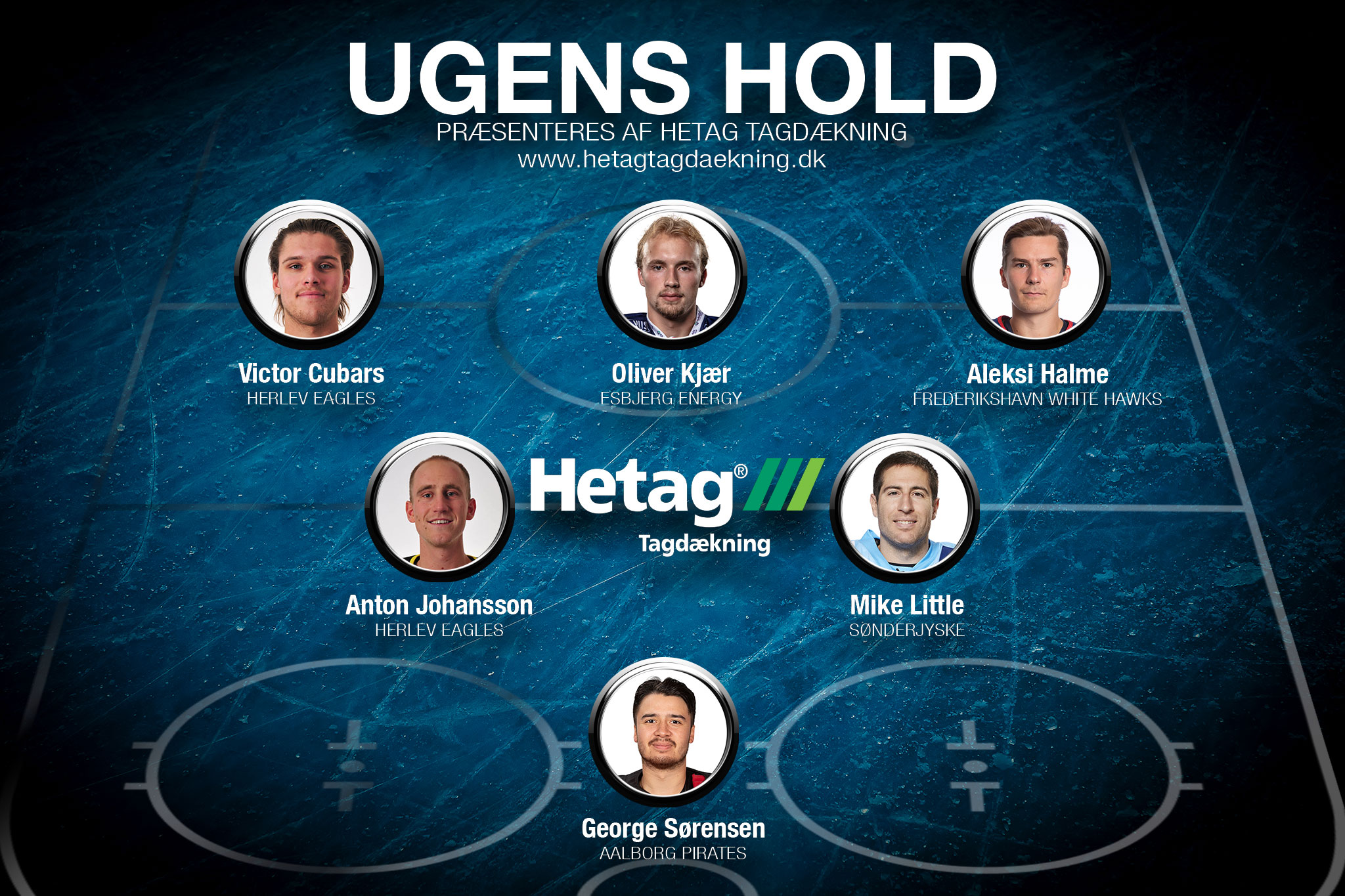 Målmand: George Sørensen (Aalborg) - Nok lukkede han en enkelt kasse ind mod Rungsted i søndags, men ugen bød også på to sejre til Sørensen og ligeledes et shutout i Bitcoin Arena. Nok til at være med inde i varmen. Vinder lige og lige duellen mod mange stærke "contenders" i den her uge, blandt andre Oskar Östlund, der leverede vilde 46 redninger i kamp fem i Aalborg.