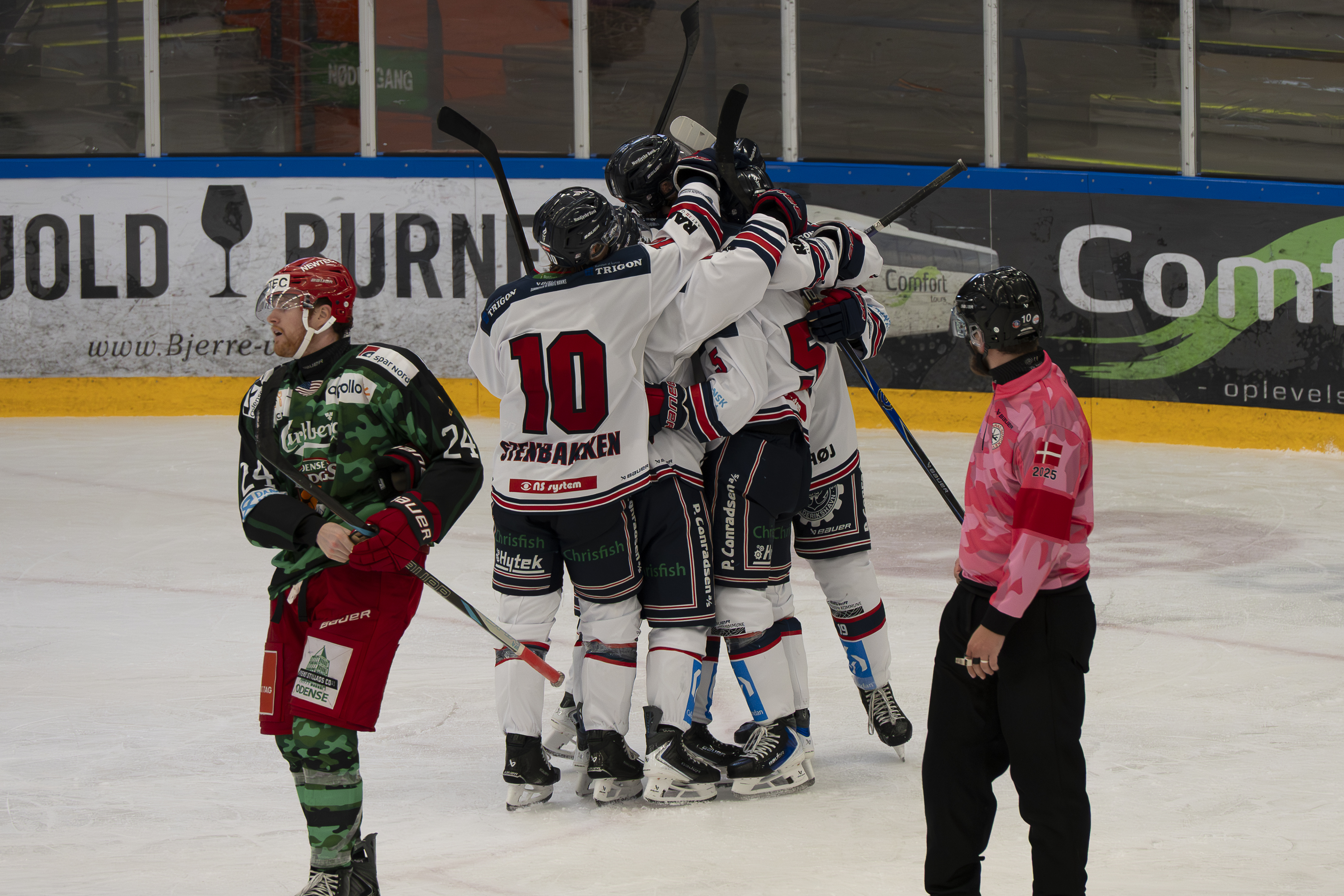 Sikke et moralsk boost til Frederikshavn, der holdt Odense stangen i en jævnbyrdig første periode, der endte 1-1. I anden periode stod Mason Klee for dagens detalje, da han med en flot dribletur eksekverede til 2-1, og Markus Jensen nettede til 3-1 kort før pausen.