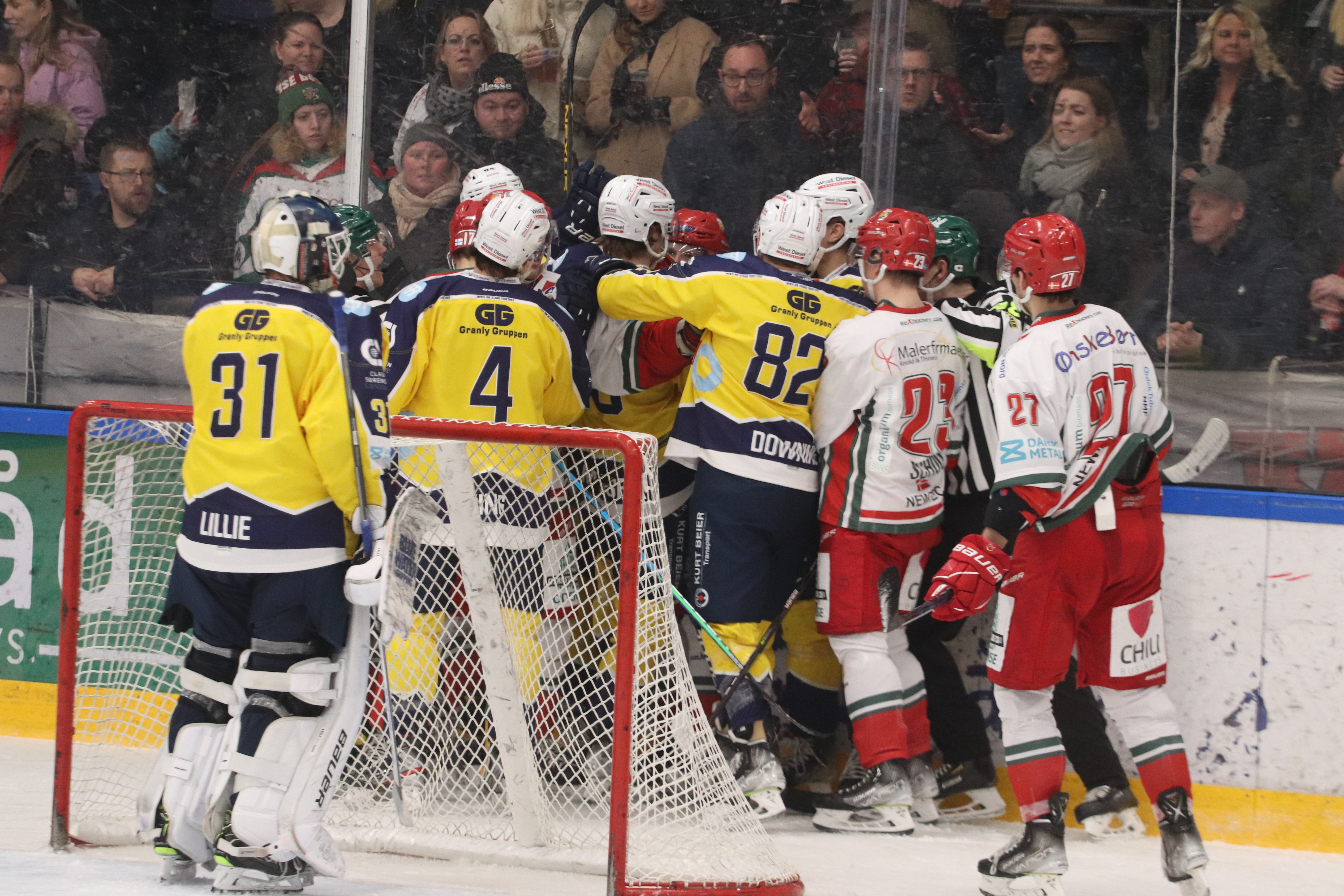 Skader/karantæner: Odense var uden Rasmus Simonsen, mens gæsterne måtte undvære Ryker Killins, Travis Brown, Kale Kerbashian, Andreas Grundtvig og Henrik Mærsk Clausen.