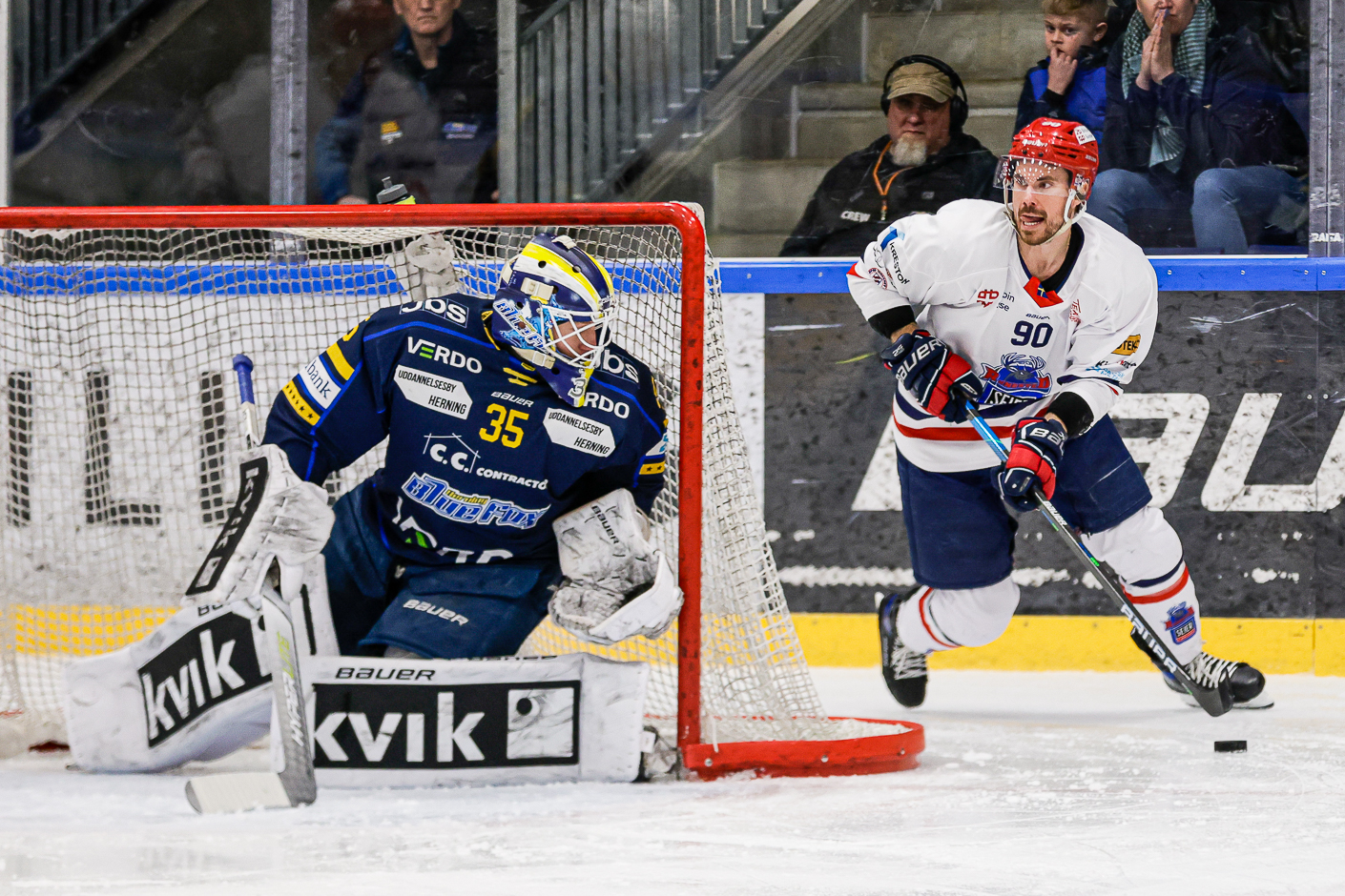 I den anden ende havde Emil Kruse til gengæld store problemer, og han kunne takke Jarkko Malinen for at redde pucken inde på stregen. Vanvittig redning af Malinen som virkelig tog en for holdet.
