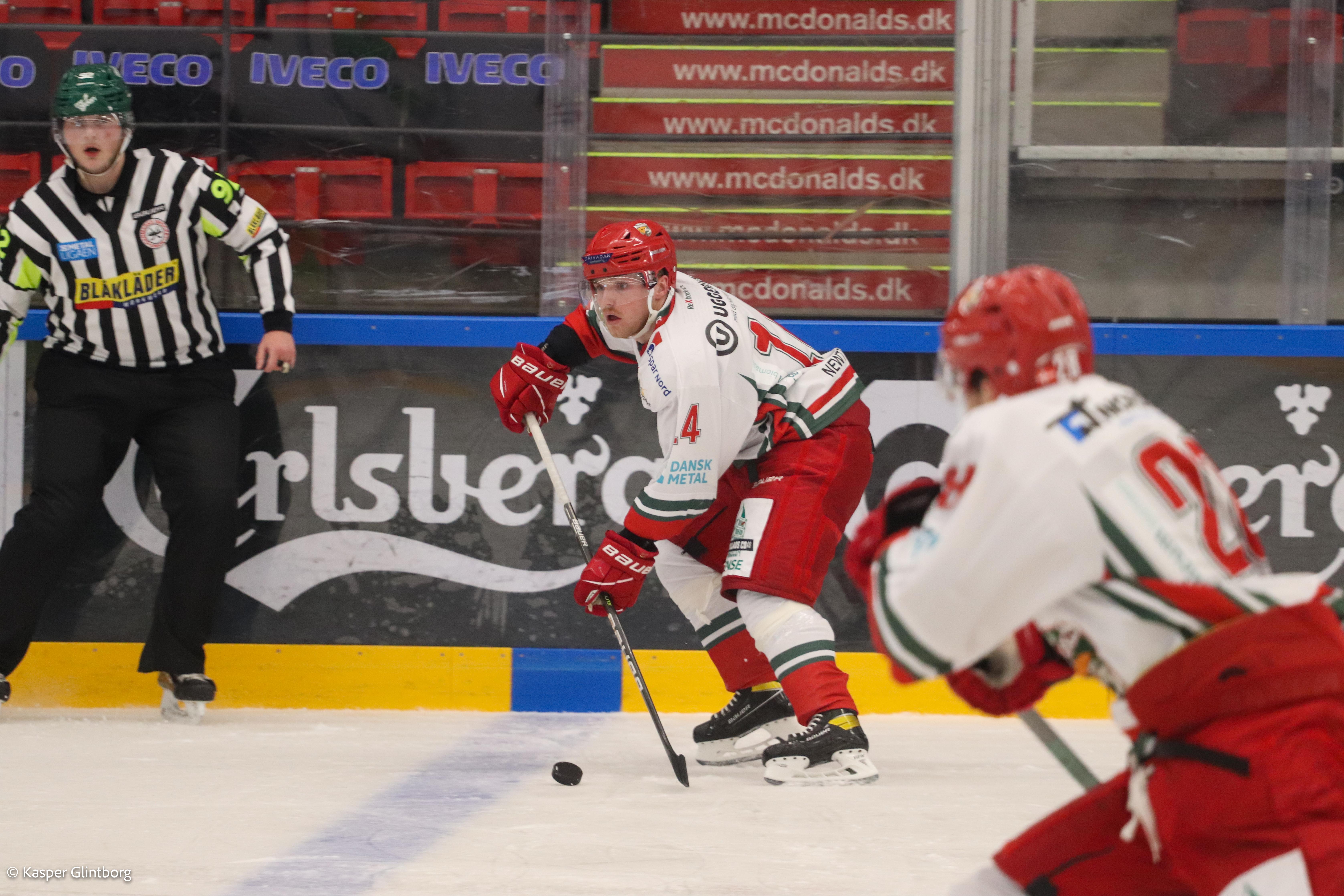 Martin Larsen satte en tackling, som efterfølgende blev takseret til checking to the head på Gustav Green, og det ville Jacob Gammelgaard ikke finde sig i, og det endte i en gedigen fight mellem Larsen og Gammelgaard. Dobbelt game misconduct til Larsen og Gammelgaard også i bruseren før tid.