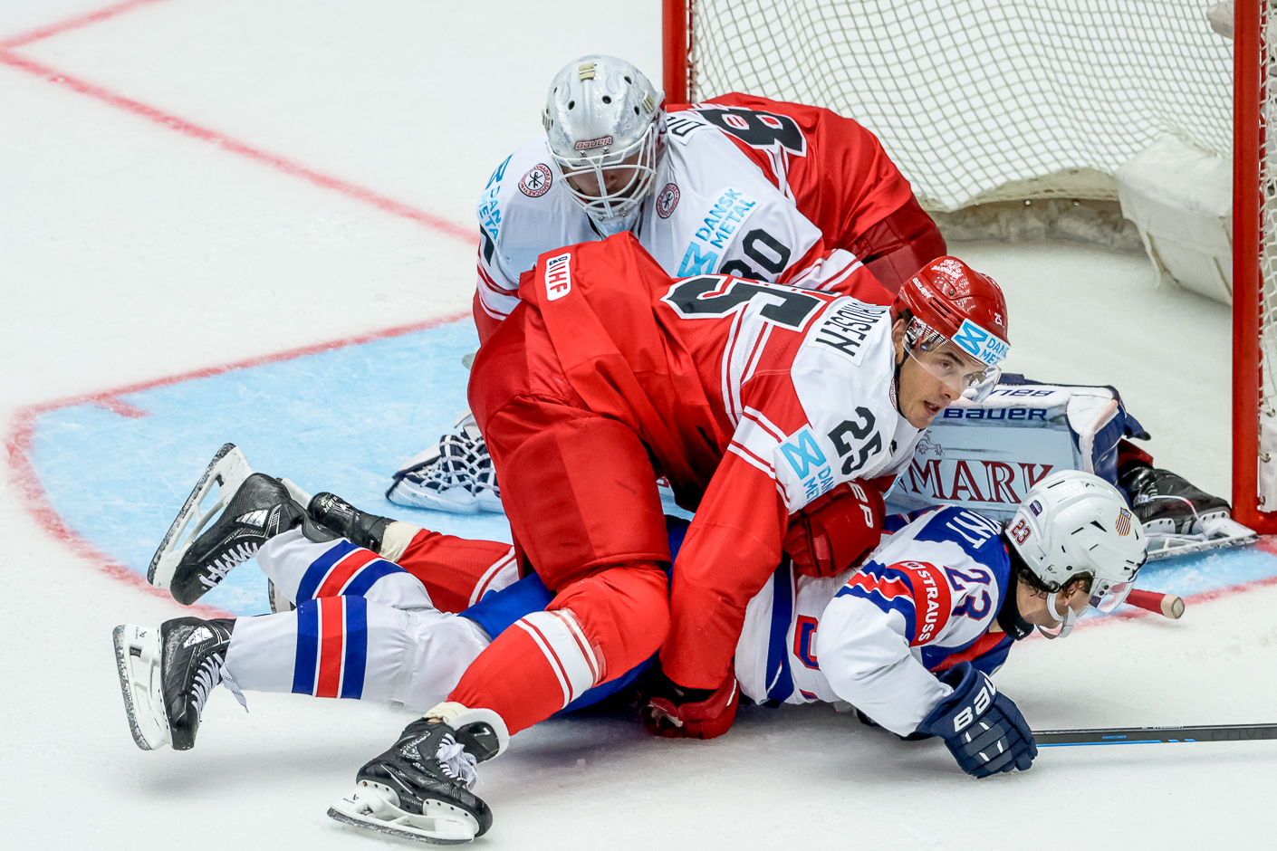 Boxen var udsolgt og fyldt med feststemte og farverige danske fans, da de danske løver fredag aften åbnede VM-turneringen med opgøret mod USA. Amerikanerne stillede med et stærkt mandskab, der i langt overvejende grad bestod af NHL-spillere. Følgende spillere fra den danske bruttotrup var udeladt under kampen mod amerikanerne: Mathias Seldrup, Daniel Baastrup, David Madsen og Felix Scheel. Målmandsduellen stod mellem Joey Daccord og Frederik Dichow.